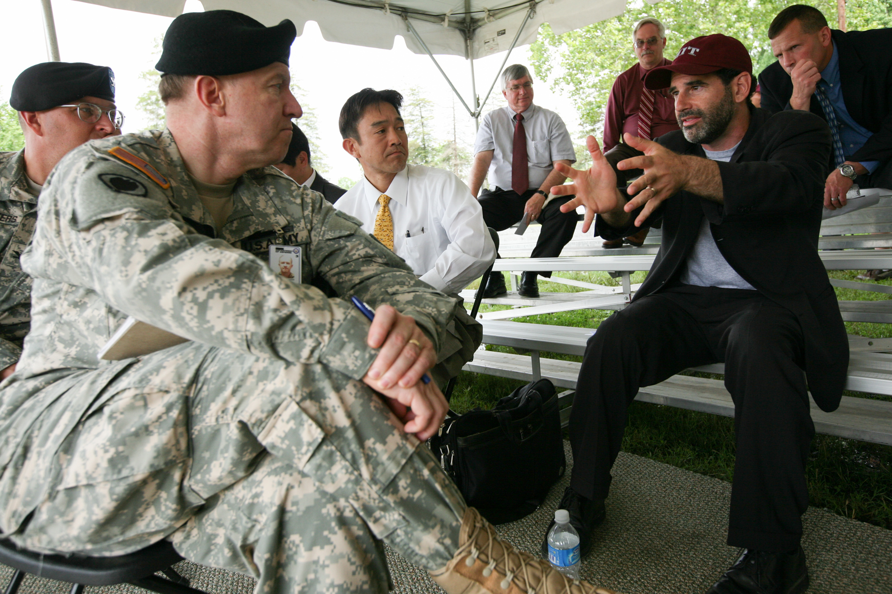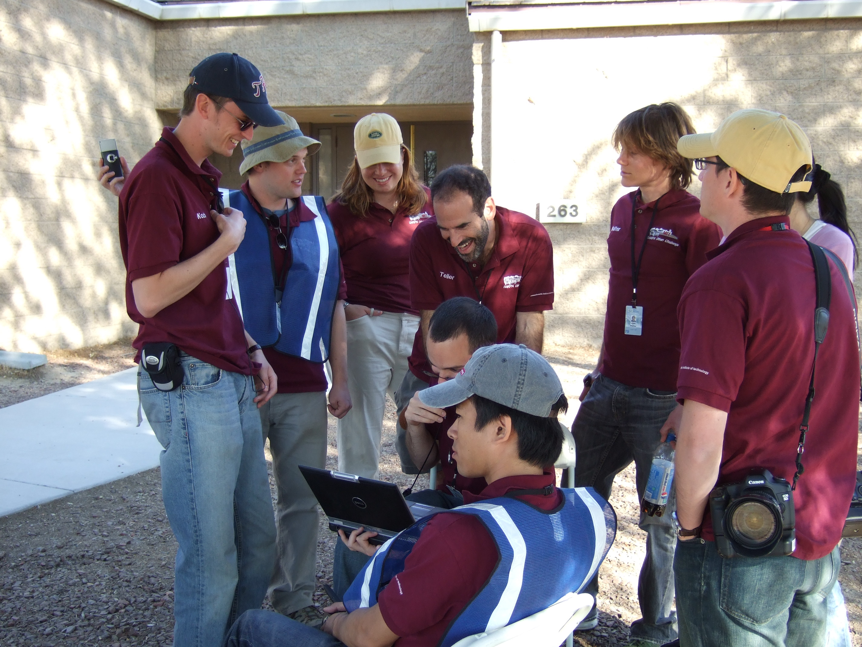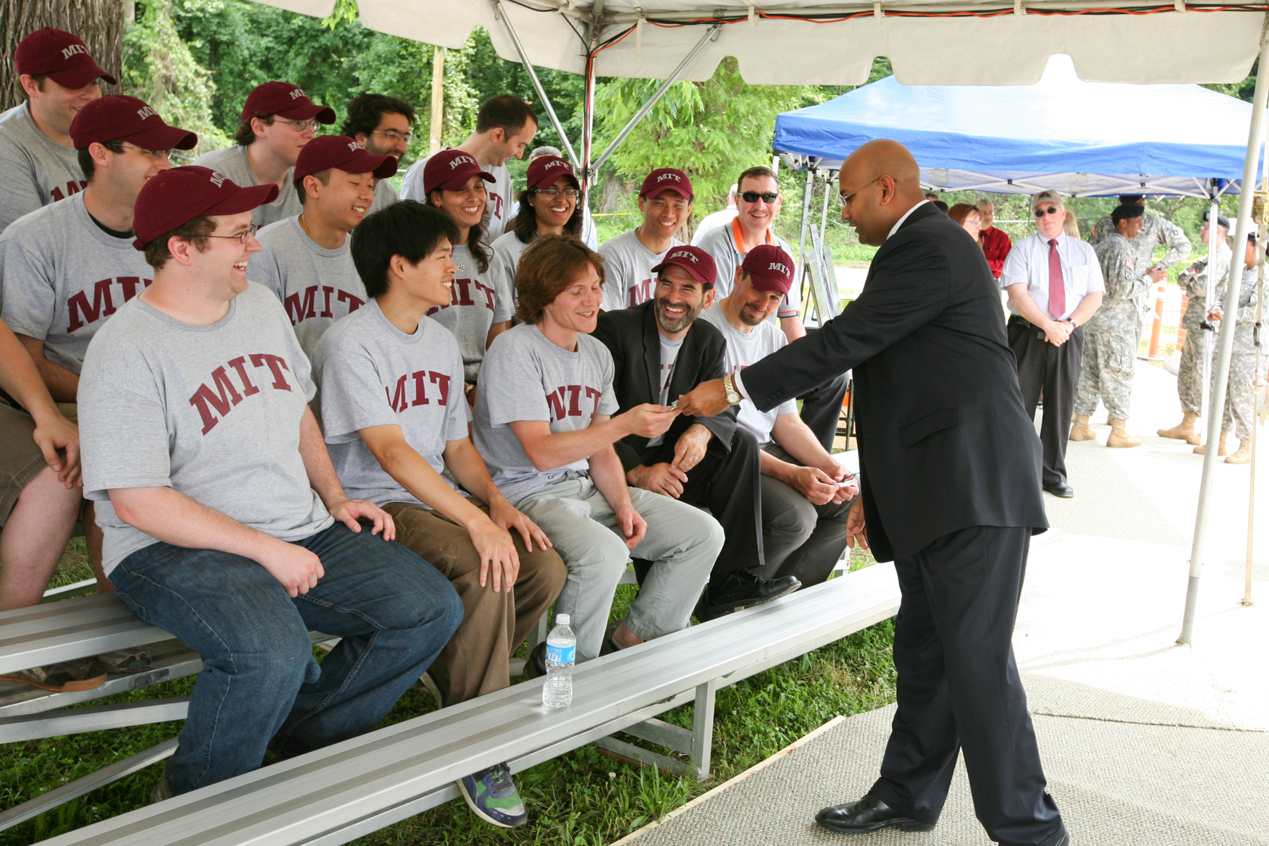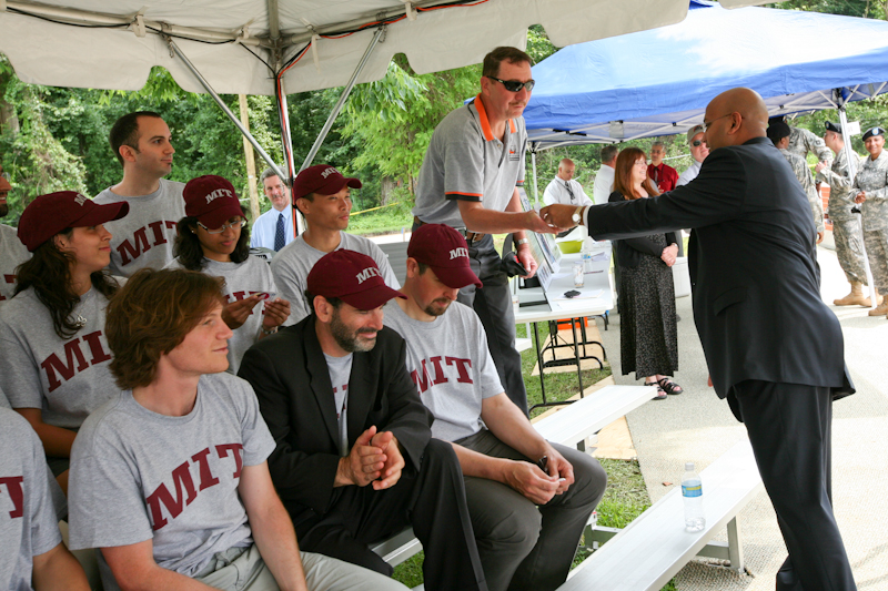 I helped Ekapol Chuangsuwanich with the speech commands for the forklift demo at Fort Lee in Virginia. We worked outside in mid-90s temperatures for several long days preparing for the four demos at the end. One part of the group was busy finding a way to keep the forklift laptops cool enough and cam up with a solution that involved a disassembled hand-held vacuum, a basked of dry ice, and, of course, duct tape. Our part was originally to use four microphones mounted on top of the forklift to be able to stop the forklift by shouting "stop" at it, which we actually had to make use of once. But then we added the ability to issue commands to the forklift, just as they could be issued via the hand-held device. About a day and a half before the actual demo, Seth had the crazy idea of summoning the forklift using the bullhorn, something which was clearly impossible because of the distance to the forklift, the distortion, and all the construction background noise, so we spent the next day collecting bullhorn samples and training new speech recognition models at MIT over a flaky wireless connection, and squeezed in a little testing and it actually worked. You can see it at the beginning of the movie from the demo when Matt Walter says "Forklift, come to receiving." That could never have happened without Seth's confidence making the impossible possible and his great leadership of that large team.
