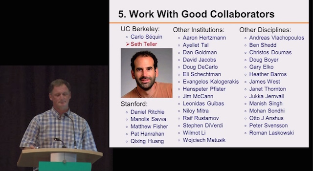 Seth was my top PhD student. He was the only one among 27 students, whom I had the pleasure to advise, who chose and defined the topic and scope of his dissertation on his own. After he had spent a summer at SGI he came back all fired up and knew just what he wanted to do: speed-up real-time walk-throughs through complex buildings by doing a careful and totally accurate pre-analysis of what can possibly be seen from a particular location within a building. For this purpose the building was cut up into cells, typically the size of a small room, and a table was established showing what other cells one could possibly look into from the cell containing the observer. The algorithm to do this used an elegant stab-line algorithm based on 5-dimensional Pluecker coordinates, which figured out the farthest distance that a light ray could travel through a sequence of portals (i.e., doors or windows) linking one cell to its neighbors. Only the cells that one could possibly look into were then sent through the graphics rendering pipeline; this was typically just a few percent of the whole building geometry. The resulting speedup was from about 20 times to 100 times. Seth was equally well versed in computer theory, geometry, and computer graphics techniques, and he could blend all of this together to achieve outstanding and important results.